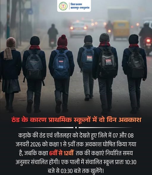 कड़ाके की ठंड और शीतलहर के कारण कक्षा 1 से 5 तक अवकाश घोषित